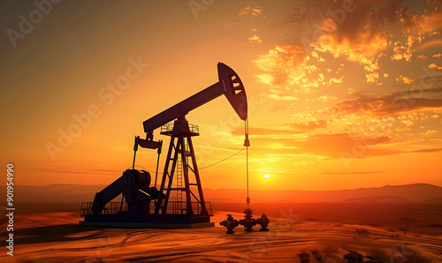 silhouette of oil rig pumping crude oil against vibrant sunset sky, industrial energy production, environmental impact awareness, suitable for marketing and education,...
