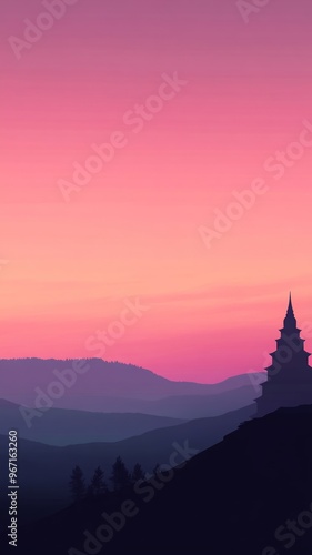 silhouette, pagoda, sunset, vibrant, sky, colourful, gradient, landscape, horizon, twilight, peaceful, mountain, serene, travel, zen, scenic, panoramic, dawn, calmness, architecture, eastern, culture, meditation, dusk, nature, sunrise, spiritual, peacefulness, harmony, southeast, asia, calm, hill, silhouette, artistic, view, solitude, tour tourism