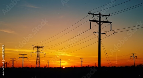 sunset, powerline, electricity, silhouette, sky, sunrise, twilight, electric power, energy, industry, line, landscape, nature, orange, rural, engineering, communication, cable, infrastructure, supply, distribution, transmission, technology, wire, pole, dusk, evening, dawn, outdoors, scenic, dramatic, visual, vibrant, orange sky