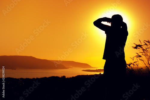 Silhouette of relaxed man enjoying sunset time, watching at river or lake water. Relaxation and leisure concept. Copyspace