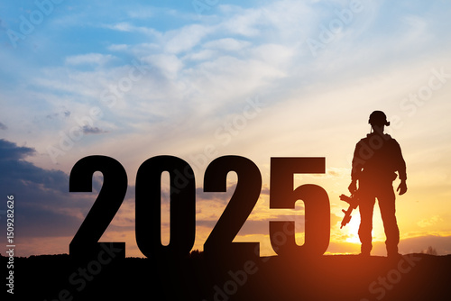 Silhouette of soldier and 2025 against the sunrise or sunset.