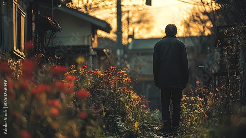 Silhouette of Solitude: A solitary figure walks through a path, their back turned toward the camera, as the sun sets in the distance, casting an ethereal glow over the vibrant flowers.