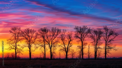 Silhouette of trees against a vibrant sunrise sky, nature awakening to a new day