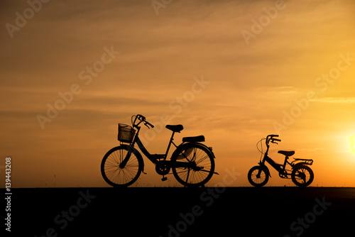 Silhouette of vintage bicycles on the road with the sunset background.