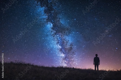 hill, person, sky, star, night, silhouette, awe, universe, grass, shrub, horizon, wonder, immensity, blue, pink, purple, summer, star, nature, man, abstract, illustration, outdoors, adult, futuristic, planet, science, space, success
