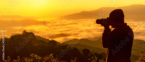 Silhouette professional man photographer holding camera for take a photo the mountain field during mist sunrise nature.