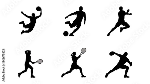 silhouette, sport, basketball, football, running, tennis, volleyball, athleticism, motion, activity, action, dynamic, figure, shape, contour, human, person, isolated, exercise, fitness, competition, game, player, practice, movement, strength, agility, stamina, endurance, sharpened, dedication, training, recreation, leisure, pastime, physical, energetic, vigorous, healthy, active, skill, coordination, balance, discipline