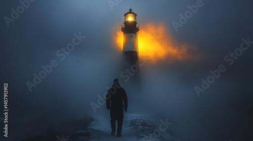 lighthouse, coast, shore, sea, ocean, stormy, cloudy, overcast, silhouette, man, person, walking, distance, horizon, loneliness, isolation, mystery, dramatic, moody, contemplative, melancholy, atmospheric, seascape, landscape, artwork, painting, oil painting, texture, artist, artistic, creative, imagination, concept, abstract, figurative, obscure, vague, spiritual, path, journey, exploration, guidance, hope, inspiration, nautical, maritime, weather, ominous