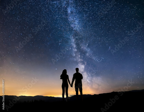 milky way, galaxy, couple, holding hands, night, star, astronomy, love, romance, silhouette, mountain, landscape, sky, nature, space, universe, starry, dark, light, travel, adventure, romantic, togetherness, human relationships, scenic, beauty, inspiration, wonder, exploration, celestial, cosmic, night time, outdoors, horizon
