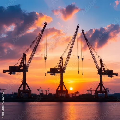 impact, conflict, crane, sunset, industrial, water, men at work, logistic, efficiency, shipping, trade, movement, twilight, machinery, innovation, skyline, engineering, safety, dusk, structure, horizon, silhouette, transport, productivity, cargo, scene, harbor, operation, maritime, port, evening, technology, light, cloud, modern, urban, orange, blue, sky, design, equipment, beauty, activity, construction, environment, architecture, landscape