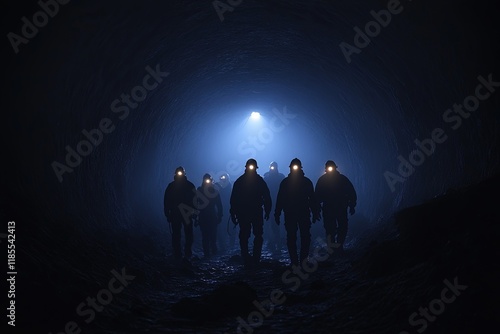 tunnel, figure, silhouette, dark, blue, light, exploration, expedition, mystery, adventure, atmosphere, tension, shadow, composition, dramatic, mood, scene, setting, optical, photo, imagery, artwork, image, graphic, design, commercial, marketing, industrial, mining, cave, underground, blue-toned, team, group, journey, path, forward, progress, people, business, woman, illustration, sunset, man, walking, night