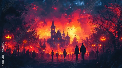night, sky, red, church, people, figure, silhouette, walking, glowing, crimson, dark, forest, tree, leaf, branch, city landscape, town, gothic, skittish, eerie, halloween, pumpkin, orange, yellow, flames, fire, ominous, mysterious, creepy, haunted, abandoned, supernatural, mystical, fantasy, artwork, illustration, digital, art, painting