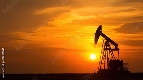 Silhouetted Oil Pump Jack Against a Vibrant Sunset Sky with Warm Hues Emphasizing Industrial Energy Production