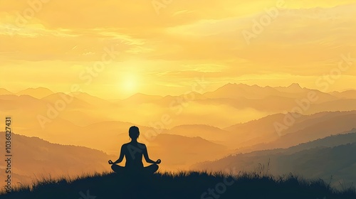 Silhouetted Person Meditating on Hilltop During Serene Sunrise Landscape