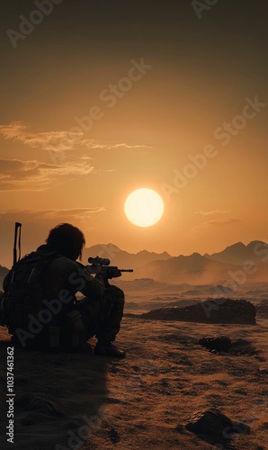 soldier, sunset, desert, mountain, silhouette, sharpshooter, scope, rifle, military, camouflage, backpack, weapon, gold, dusk, horizon, landscape, nature, sand, sky, evening, target, aiming, lone, wilderness, danger, war, peace, tactical, combat, vigilance