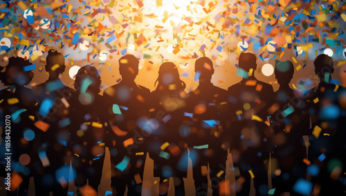 silhouette, team, celebration, confetti, backlight, crowd, party, festive, success, corporate, teamwork, achievement, people, event, stage, glowing, warm light, colourful, joyous, group, oneness, victory, audience, blurred, bokeh, night, abstract, professional, corporate culture, high fidelity, cheering, spotlight