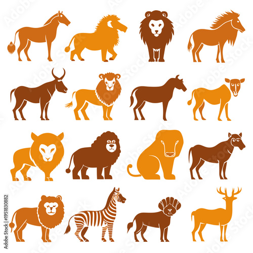 animal, animal, wildlife, mammal, lion, horse, antelope, zebra, cervid, silhouette, vector, graphic, orange, brown, set, collection, safari, nature, zoo, fauna, outline, design, illustration, simple, cartoon, mascot, logotype, icon, drawing, isolated, equine, felino, ungulate, carnivore, herbivore, art, pattern, decoration