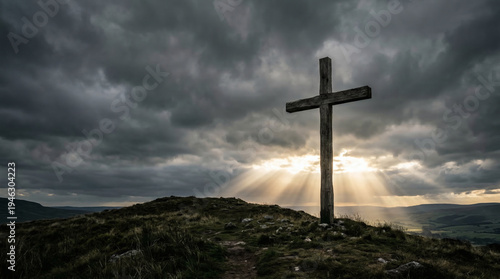 Silhouetted wooden cross against sun rays and clouds. Perfect for religious concepts, spiritual themes, or inspirational designs with deep meaning.