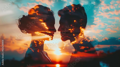Silhouettes of a couple facing each other with a stunning sunset in the background, blending nature and romance in a double exposure art style.