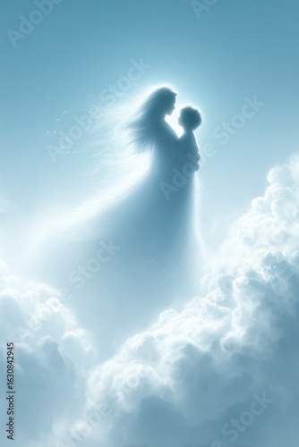 sky, bright, affection, fantastic, human relationships, silhouette, light, dreamlike, elegant, childhood, soft, amazing, mother, peaceful, hugs, gentle, comforting, decorative, pastel, stylish, colourful, imagination, spiritual, heavenly, white, divine, stunning, tenderness, cloud, modern, love, blue, uplifting, family, warmth, children, motherhood, abstract, vibrant, connection, impressionistic, marvellously, serene, figure, aethereal, beautiful, professional, creative