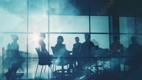meeting, office, business, people, modern, silhouette, window, large, room, blue, glasses, work, team, corporate, conference, professional, discussion, collaboration, strategy, desk, chair, table, sunlight, bright, city landscape, building, urban, interior, design, architecture, professionalism, success, sharpened, vision, future, growth