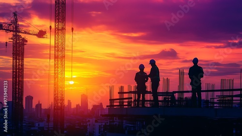 construction, men at work, sunset, silhouette, sky, city landscape, crane, building, orange, purple, pink, hard, work, industry, steel, beam, structure, urban, development, progress, silhouette, golden hour, twilight, construction site, architecture, city, skyscraper, urban scene, engineering, labor, safety, helmet, professional, teamwork, skyline, horizon, view, landscape, industrial