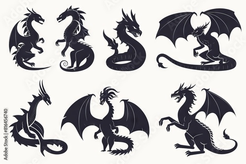 Silhouettes of dragons, depicted in various shapes and sizes, appear as black vector icons against a white backdrop. These designs embrace a straightforward style, characterized by flat colors