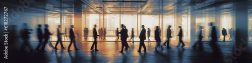 Silhouettes of group of people in business office with motion blur effect. Crowd of unrecognizable people walking in building with glass facade. City life. Created with Generative AI
