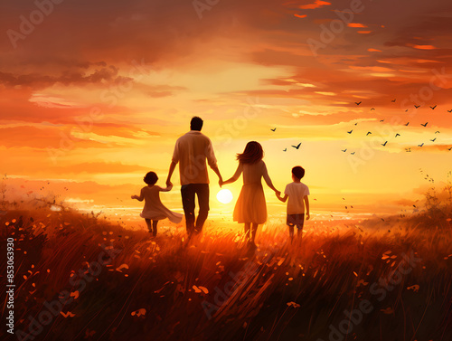 Silhouettes of happy family holding the hands in the meadow during sunset.