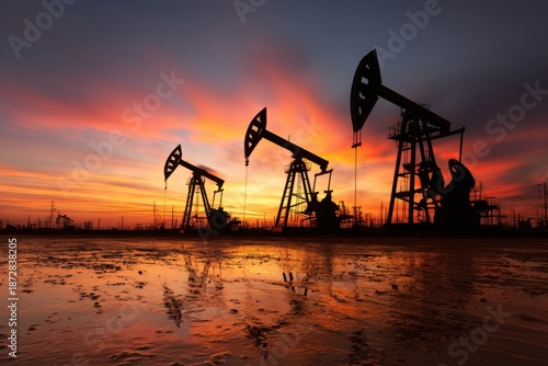 Silhouettes of oil pump jacks operating in an oil field during a breathtaking sunset with vibrant colors illuminating the sky and reflecting on the ground
