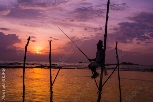 Silhouettes of the traditional Sri Lankan stilt fishermen at the sunset in Weligama, Sri Lanka. Stilt fishing is a method of fishing unique to the island country of Sri Lanka