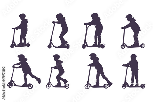 Silhouettes Set of Kids Riding Scooters in Action Poses. Jumping, Pushing, Performing Tricks. Vector Clipart Vector Illustration.