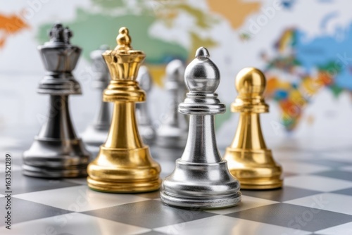 Silver and gold chess pieces on a board, with a world map in the background, representing global strategy and competition.