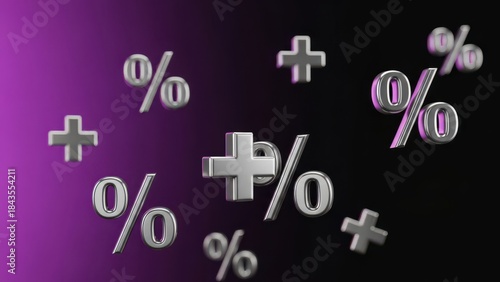 Silver percentage and plus signs floating against a vibrant purple and black gradient background with professional 3D effect ideal for finance and statistics illustrations