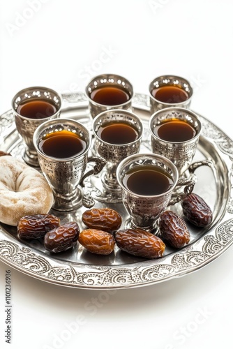 hot drink, cup, date, tray, silver, metal, ornate, dessert, cookie, sweet, food, drink, beverage, arabic, islamic, ramadan, culture, tradition, hospitality, garnish, luxury, elegant, delicious, refreshment, presentation, tableware, arrangement, still