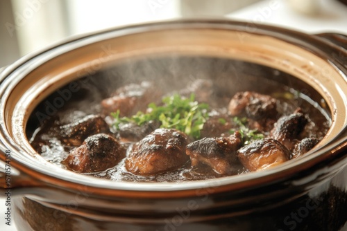 Simmering Culinary Delight: A mouthwatering close-up captures a pot of steaming, freshly cooked, succulent, flavorful meal, ready to serve, and full of taste.