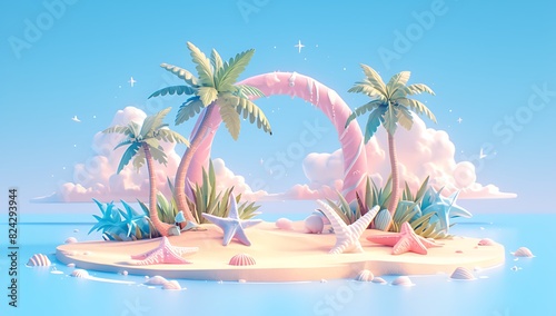 beach, pink, blue, palm tree, cloud, seashell, minimalist, cute, simple, art, creative, hand-made, craft, tropical, vacation, summer, scenery, design, decoration, coastal, oceanic, artistic, aesthetic, ocean life, tranquil, relaxing, paradise, whimsical