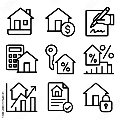Simple Black Line Icons Representing Real Estate Transactions.