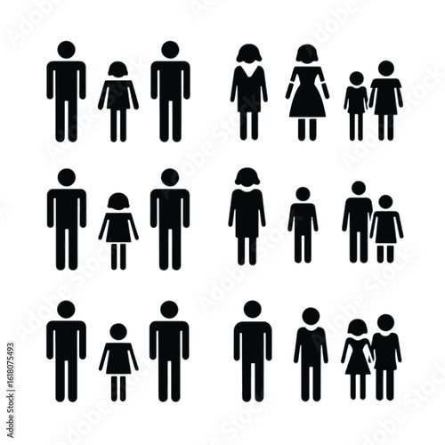 Simple Black Pictogram Illustrations of Men Women and Children Representing Families and Human Interactions on White Background