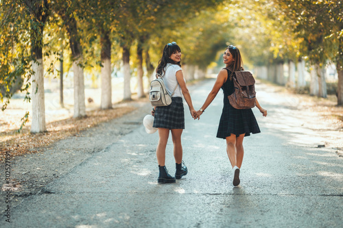 avenue, autumn, woman, along, friends, walking, fun, couple, together, road, sunny, friendship, girl, woman, 2, sister, romance, lesbian, love, landscape, wildness, park, path, travel, backpack, countryside, footpath, nature, outdoors, togetherness, holding hands, backview, horizontal