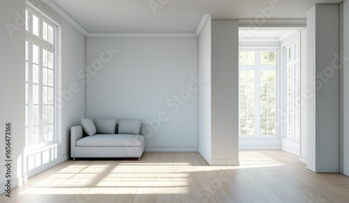 room, simple, empty, light, grey, wall, white, ceiling, single, sofa, bright, natural, lighting, large, window, soft, shadow, clean, minimalist, space, design, furniture, placement, calm, atmosphere, background, presentation, modern, interior, architecture, home, window, house, floor, apartment, wall, nobody, parquet, new, indoor, door, open, view, living room, bedchamber, loft, kitchen, inside