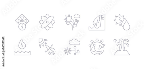 simple gray 10 vector icons set such as geyser, earth, energy, house effect, hydraulic energy, hydro power, hydroelectric power station. editable vector icon pack
