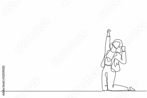 Single continuous line drawing happy businesswoman kneeling with raised one hand high and raised the other. Saleswoman celebrates salary increase from company. One line draw design vector illustration