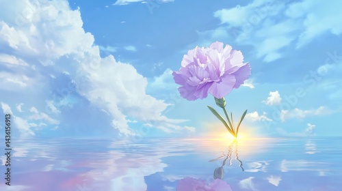 Single pink carnation flower floating on calm water with a bright sun and fluffy clouds in the background.