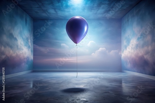 balloon, purple, room, empty, sky, cloud, painted, interior, single, floating, light, aethereal, dreamlike, surreal, atmospheric, reflective, floor, wall, space, tranquil, serene