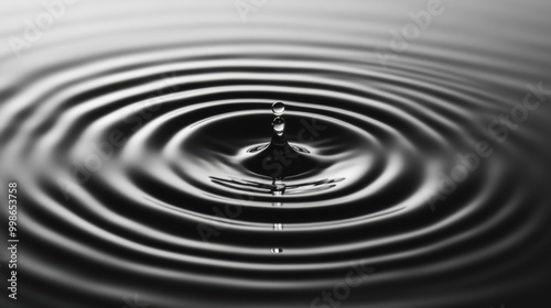 single water droplet creates ripples in calm pond, showcasing beauty of natures simplicity and tranquility. monochrome effect enhances serene atmosphere