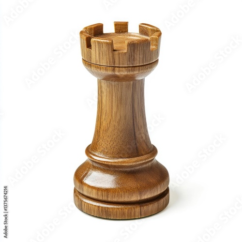 Single Wood Chess Rook Piece on Isolated White Background Studio Shot