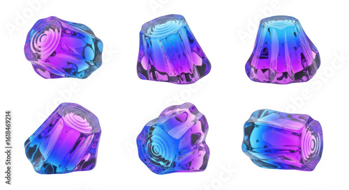 Six abstract glowing crystals are displayed against a white backdrop showcasing varied angles and internal structures Useful for science fiction fantasy themes