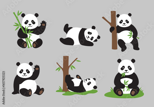 panda, bear, animal, wildlife, mammal, nature, bamboo, plant, tree, green, black, white, cute, adorable, cartoon, illustration, design, graphic, set, collection, pose, sitting, lying, eating, holding, waving, happy, cheerful, playful, fun, friendly, forest, habitat, environment, background, isolated, character, smiling, eye, ear, paw, fur, body, face, shape, round, spot, marking, pattern
