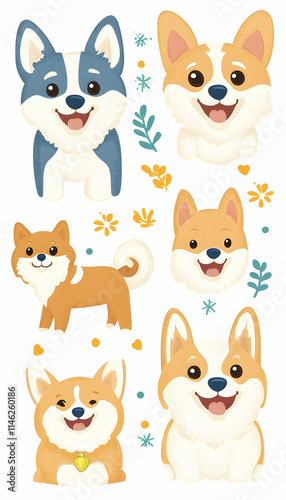 Six Corgis, various poses, digital art with leaves, stock for greeting cards or pet products.